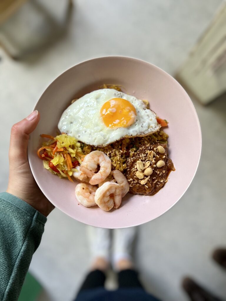 Heb jij soms ook zo veel zin in pindasaus? 🥜 Wij wel! Dan maken we vaak deze koolhydraatarme nasi gemaakt van bloemkoolrijst. Voor extra eiwitten voegen we wat garnalen 🦐 en een gebakken eitje 🍳 toe. Jummie!
