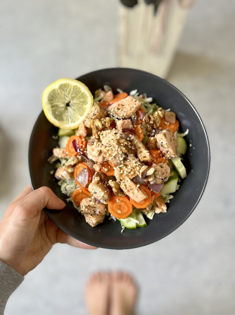 Deze koolsalade zit vol met gezonde omega-3 vetten en is heerlijk fris voor het warme weer! Houd je niet van kool? Vervang deze dan met wat spinazie of sla. 🥒🥕