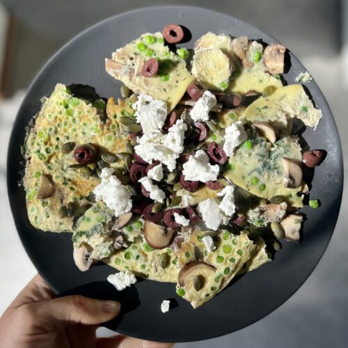 - Leg de omelet op een bord en bestrooi met geitenkaas en zwarte olijven. Enjoy!